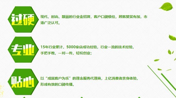 操作快,好上手,人人都能做:操作简单,通过代理总部统一店铺设计、成熟的技术培训、成套的自动化机器等,可以快速开店,快速起步,快速赢利,完整的系统复制,更利于成功经营。